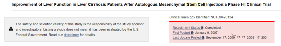 一项在西班牙巴塞罗那已经完成的,(注册编号为:NCT02557010)同种异体骨髓间充质干细胞治疗慢性肝功能衰竭的临床疗效试验中,研究小组于2016-2018年共招募30个肝病患者入组参加该项研究,患者年龄18岁至79岁。