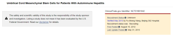 中国人民解放军第302医院肝病生物治疗研究中心,王福生医生所在的研究小组,开展一项题为“脐带间充质干细胞治疗自身免疫性肝病疗效和安全性的第1/2阶段研究”的临床试验(注册编号:NCT01661842)。