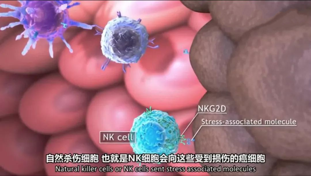 免疫系统中的细胞其实一直都在监控着我们身体中的组织,自然杀伤细胞简称NK细胞会向这些受到损伤的癌细胞释放和应激反应相关的分子。