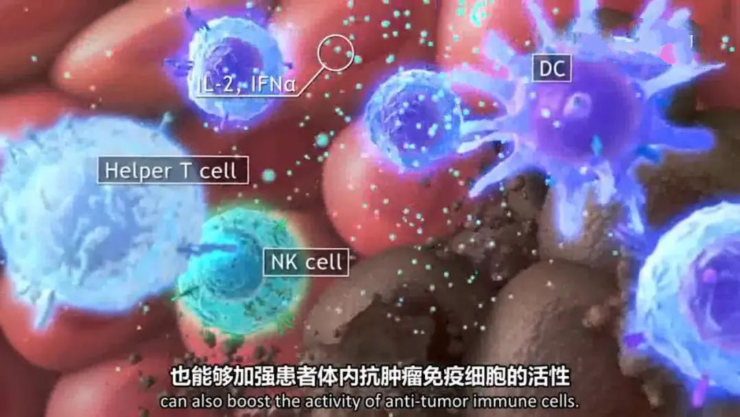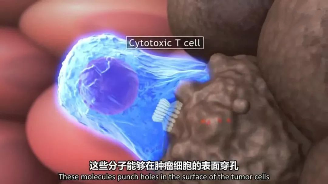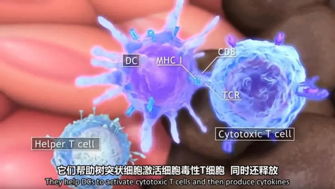 树突状细胞简称DC细胞能够激活细胞毒性T细胞,这些细胞毒性T细胞能够用他们的T细胞受体和其他辅助受体呈递和肿瘤相关的抗原,一旦被激活,NK细胞和细胞毒性T细胞便会释放穿孔素和颗粒酶,这些分子能够在肿瘤细胞的表面穿孔,进而使得它们发生细胞凋亡。